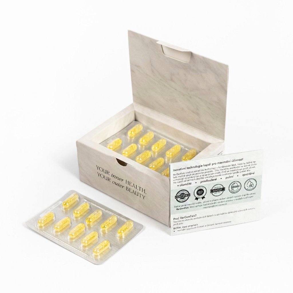 Re-GenEsis využívá průlomovou mikrokapslovou technologii, která umožňuje kombinaci jinak neslučitelných látek a zajišťuje jejich biologickou dostupnost. Díky vícefázovému uvolňování se aktivní složky vstřebávají přesně tehdy a tam, kdy a kde je tělo nejvíce potřebuje – okamžitě, pulzně, s prodlouženým účinkem nebo se zpožděním. Pokročilý systém chrání stabilitu a bioaktivitu klíčových nutrientů, jako jsou Omega-3, D3, K2, biotin a kyselina listová, a umožňuje tak jejich optimální využití v organismu.