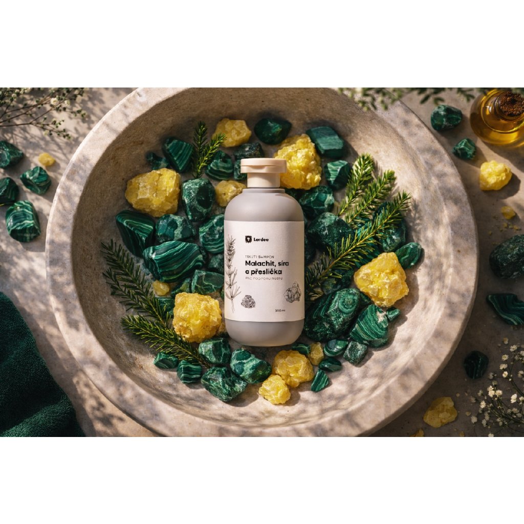 Objevte sílu přírody s naším přírodním šamponem na podporu růstu vlasů, který kombinuje účinky malachitu, síry a přesličky. Tato jedinečná kombinace složek je navržena tak, aby posílila vaše vlasy, zklidnila pokožku hlavy a podpořila zdravý růst vlasů.