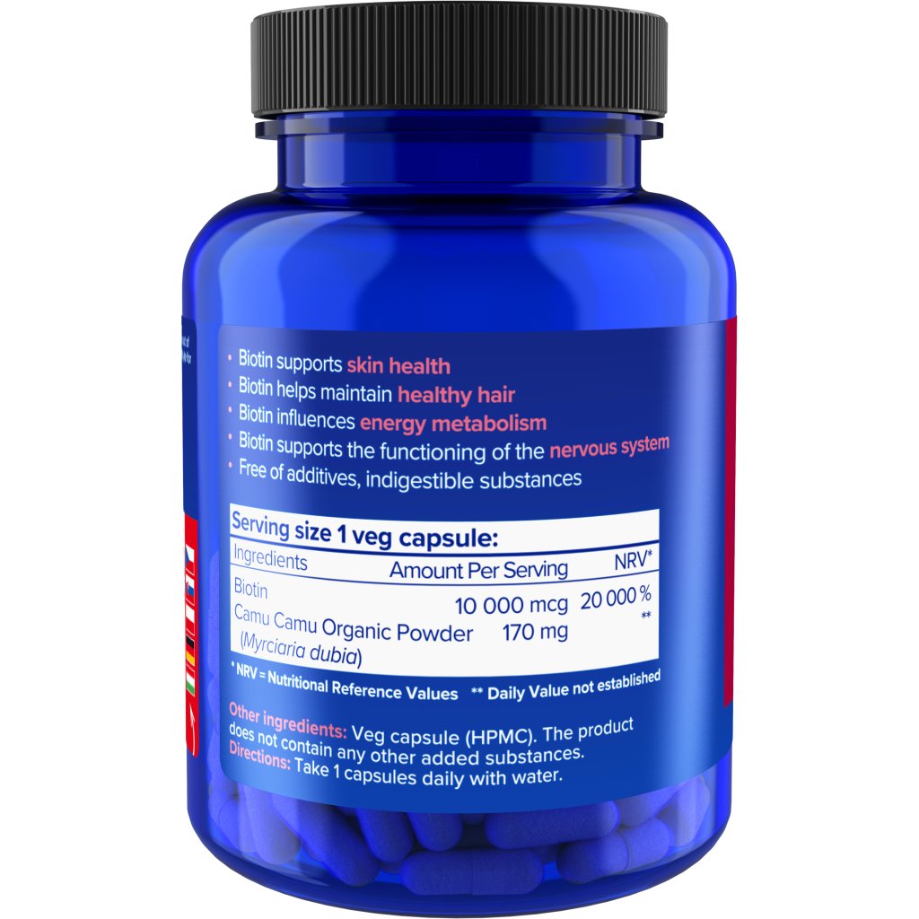 Biotin, označovaný také jako vitamín B7 nebo H, je ve vodě rozpustný vitamín, který je klíčový pro růst vlasů, pevnost nehtů a zdraví pokožky. Každá kapsle obsahuje silnou dávku 10 000 mcg biotinu a 170 mg organického camu camu – přírodního vitamínu C, který zvyšuje účinnost a vstřebatelnost.
