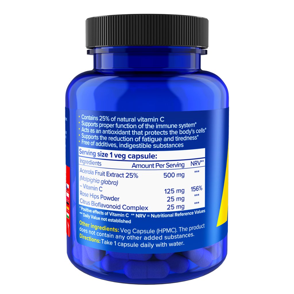 Každá veganská kapsle obsahuje 25% extrakt z plodu aceroly, který dodává 125 mg vitamínu C (156 % doporučené denní dávky). K tomu je ale navíc doplněn o 25 mg bioflavonoidů a 25 mg růže šípkové. Díky této kombinaci je doplněk mnohem účinnější než klasické čisté vitamíny C, přičemž tělu přináší více benefitů pro celkové zdraví.